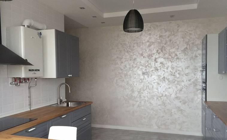 Фактурная штукатурка имитирует различные негладкие поверхности, благодаря ей, отделка приобретает неповторимый и оригинальный вид.